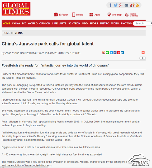云陽網(wǎng)訊(記者 楊梅娜)1月22日,“云陽侏羅紀(jì)恐龍公園將全球招標(biāo)”登上《環(huán)球時報》。報道原標(biāo)題為《中國侏羅紀(jì)公園呼喚全球人才》。