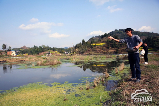 在龍王橋社區(qū)八組,一個(gè)個(gè)蝦池有序排列著,陽(yáng)光灑在蝦池水面上,閃著金光,楊寶貴夫妻倆一個(gè)搖著小船,一個(gè)拋撒玉米。