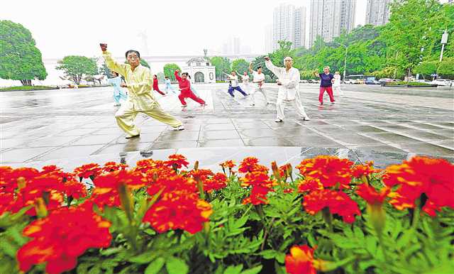6月10日,九濱路九龍外灘廣場,市民在廣場上打太極拳健身。