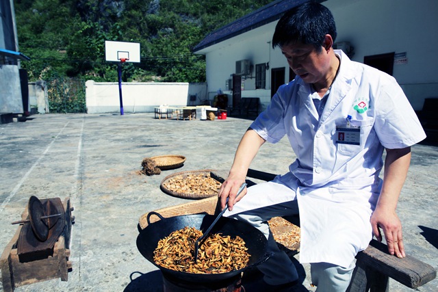 據(jù)汪忠安介紹,由于該衛(wèi)生院地處歧耀山,以前交通不方便,部分中藥材要靠當(dāng)?shù)乩习傩詹赏冢磕暝诋?dāng)?shù)匾墒斩胖佟ⅫS柏、金錢草、夏枯草、枳殼、陳皮等50余種中藥材。醫(yī)院炮制人員將收購的中藥材進(jìn)行分類凈制、切制和炮炙。凈制、切制是藥材炮制的必要工序,炮炙需要根據(jù)藥物的性質(zhì)分別進(jìn)行制碳、炒制、酒制、鱉血制等。