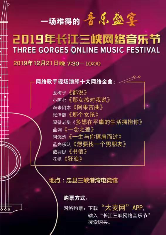 2019長江三峽網(wǎng)絡(luò)音樂節(jié)由中國大眾音樂協(xié)會、湖南廣播電視臺、重慶忠縣人民政府共同主辦。