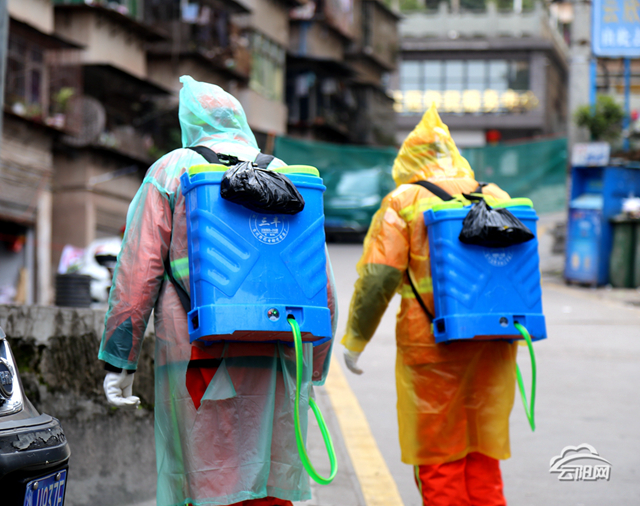 2月8日,記者來在云江大道,看到環衛工人穿著雨衣,戴著口罩,背著裝有30多斤消毒水的消毒設施,手持噴槍對城區的背街小巷、果皮箱、垃圾桶等室外公共場所進行消毒。