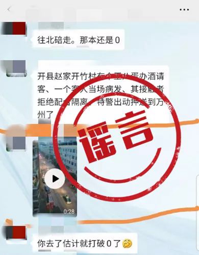 近日,網傳一則視頻信息,稱“開州區趙家街道開竹村村民辦酒席,酒席后出現大量新冠肺炎病例,當地專門出動特警押送至萬州”等。相關視頻在多個區縣的微信群持續傳播,且該謠言經改頭換面,在多地網上流傳,引發不少網民恐慌。