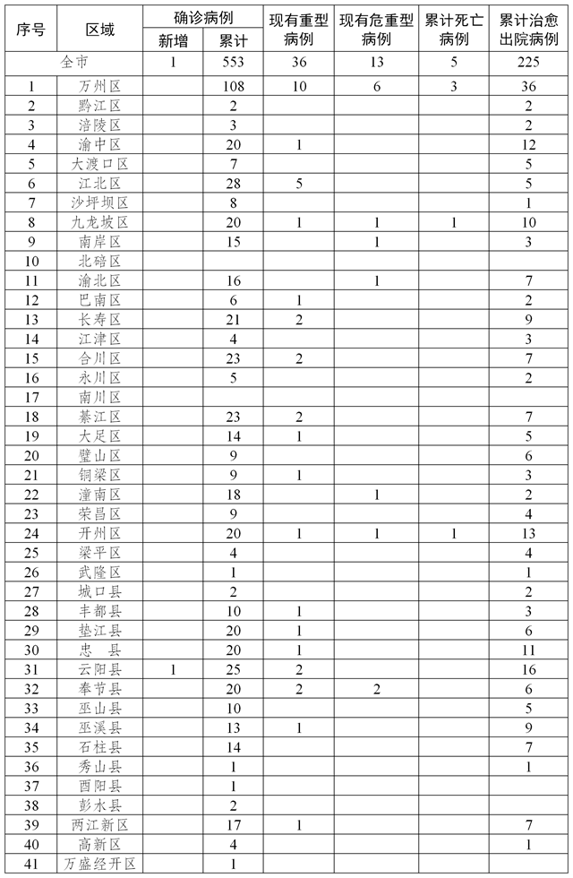 新增確診病例為云陽縣1例;新增治愈出院病例中,萬州區1例、涪陵區1例、江北區2例、九龍坡區2例、巴南區1例、江津區1例、合川區1例、綦江區1例、大足區2例、璧山區1例、榮昌區1例、忠縣1例。