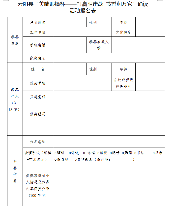活動分為家庭參賽和個人參賽兩種形式。家庭參賽對象為云陽縣常住家庭,參與家庭至少推選2名家庭成員參加,且其中至少1名為18周歲以下的未成年人。個人參賽對象為云陽縣3至17歲青少年兒童,可單獨或組隊參賽。參賽人員需錄制參賽視頻,時長為1~3分鐘,分辨率480P以上,畫質清晰,MP4格式,作品名稱為“姓名+誦讀作品名稱+聯系電話”,并附上電子版報名表和1 張參賽作者家庭生活照,發送至郵箱mengyuanma@zxllet.com進行投稿,投稿聯系人:馬夢媛,電話:18323127261。