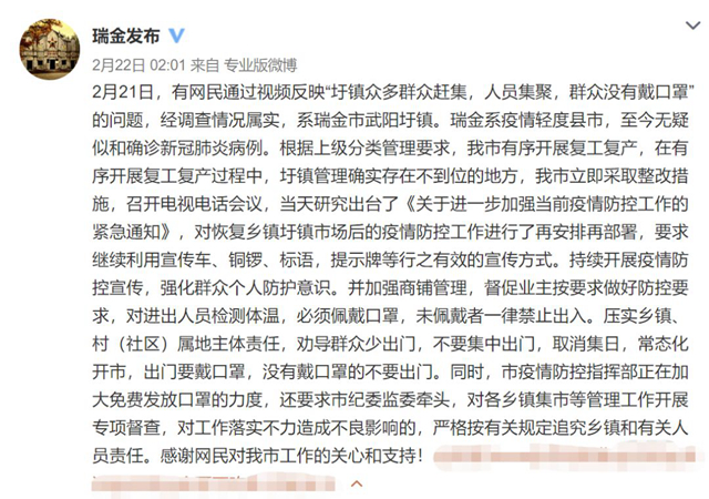視頻中標示著2月21日,集市上人頭攢動、蔚為壯觀,這里面但凡有一個感染者,后果簡直不堪設想。對此,當地政府連夜回應,宣布將立即采取整改措施。