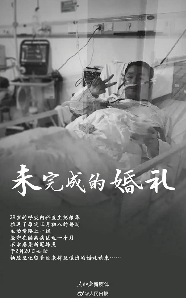 2月20日,武漢江夏區人民醫院30歲的彭銀華醫生鏖戰新冠肺炎不幸殉職。