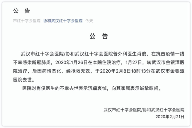 還有在武漢市紅十字會醫院工作了29年的肖俊醫生,也在2月8日倒在了抗疫一線。