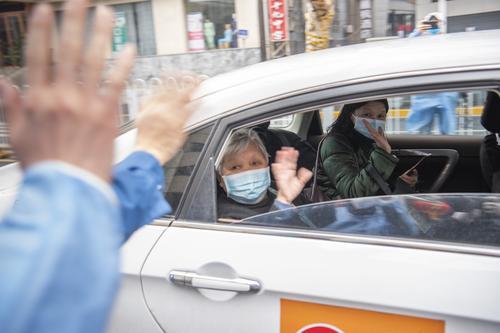 ▲2月21日,武漢市第一醫院門診門口,年齡最大的80歲黃婆婆,臨行前告別。重報集團武漢報道組 謝智強 攝