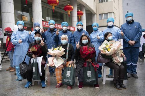 ▲2月21日,武漢市第一醫院門診門口,有4名患者由重醫附一院援武漢國家醫療隊治愈,年齡最大的80歲黃婆婆,也是這4名中的一名。重報集團武漢報道組 謝智強 攝