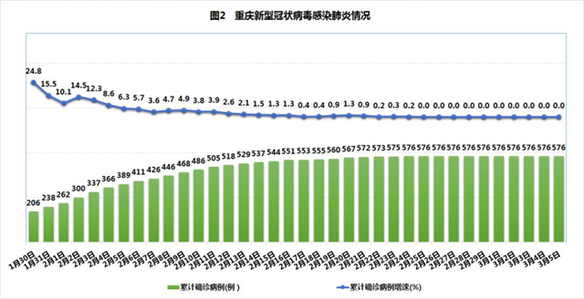 周林介紹,3月5日0-24時,重慶無新冠肺炎新增確診病例,這是第10天沒有新增病例,新增治愈出院病例10例。截至3月5日24時,重慶現有在院確診病例58例(其中重型病例4例,危重型病例1例),累計報告確診病例576例,累計治愈出院病例512例,累計死亡病例6例。累計排除3523例疑似病例,尚有4例疑似病例正在排查中。累計追蹤到密切接觸者23620人,已解除醫學觀察23351人,尚有269人正在接受醫學觀察。4個集中救治醫院現收治患者58例。