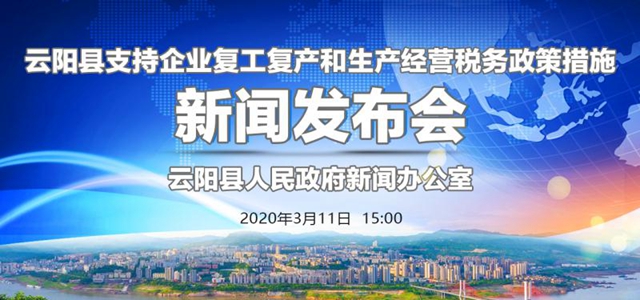 3月11日下午3:00,云陽縣人民政府新聞辦公室將舉行云陽縣支持企業復工復產和生產經營稅務政策措施新聞發布會。一是縣稅務局黨委成員、副局長陳進對重慶支持企業復工復產和生產經營稅收政策進行解讀;二是縣稅務局黨委書記、局長羅洋通報云陽縣支持企業復工復產和生產經營稅務政策措施落實情況;三是回答媒體記者的提問。屆時,云陽縣融媒體中心將通過智慧云陽APP、云陽網和云陽手機臺等全媒體平臺進行視頻、圖文直播。歡迎關注。