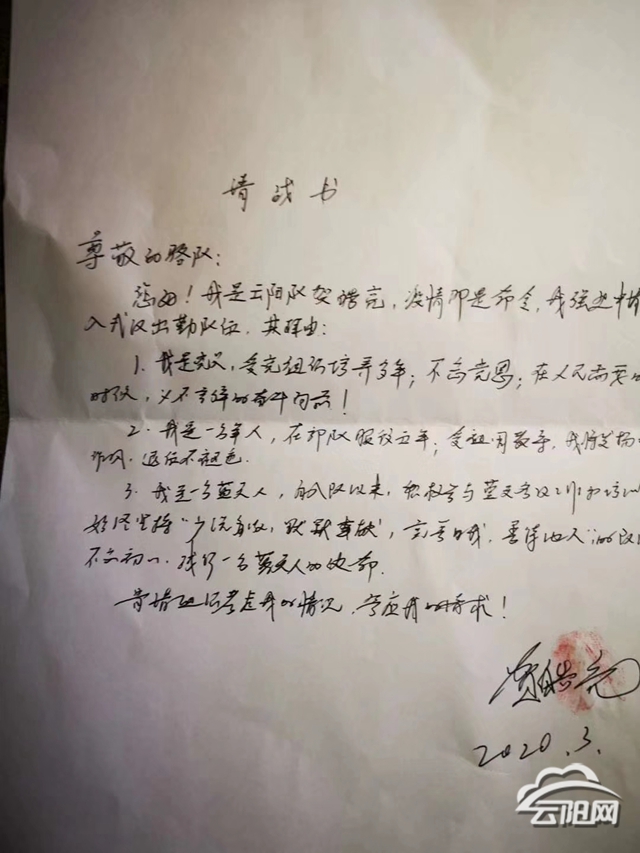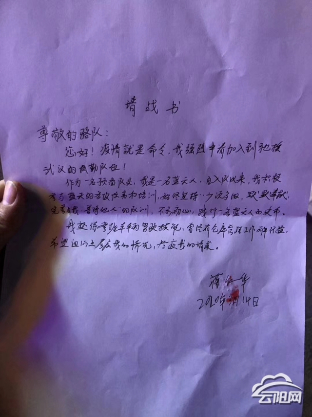 在賀皓亮的請(qǐng)戰(zhàn)書(shū)中寫(xiě)道:“我是一名黨員,受組織培養(yǎng)多年,不忘黨恩,在人民群眾需要幫助時(shí),義不容辭理應(yīng)奮勇向前。”賀皓亮是一名退伍軍人,也是孩子的父親、父母的寶貝兒子。“我的每一個(gè)身份都告訴我,我必須向前。我希望能給兒子樹(shù)立一個(gè)好榜樣。”賀皓亮眼神里充滿堅(jiān)定。