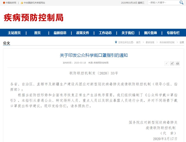 關于印發公眾科學戴口罩指引的通知聯防聯控機制發〔2020〕33號