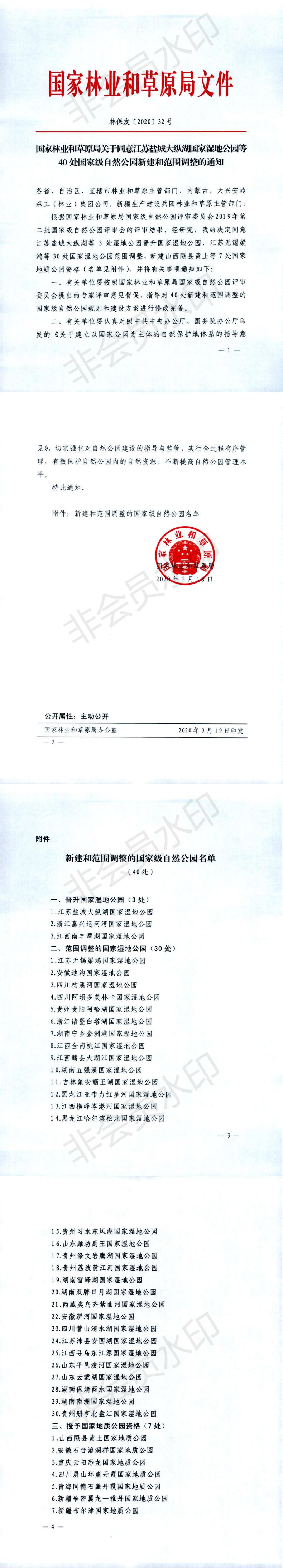 現將國家林業和草原局《關于同意江蘇鹽城大縱湖國家濕地公園等40處國家級自然公園新建和范圍調整的通知》(林保發〔2020〕32號)轉發給你們,請涉及鄉鎮、部門加強對地質公園的保護與管理。