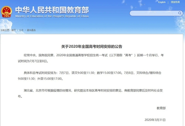 1.【云陽家長注意:今年高考延期一個月】3月31日,教育部發(fā)布《關(guān)于2020年全國高考時間安排的公告》。2020年全國普通高等學(xué)校招生統(tǒng)一考試延期一個月舉行,考試時間為7月7日至8日。(向心理引導(dǎo),加油鼓勁方向說)(來源:愛云陽)