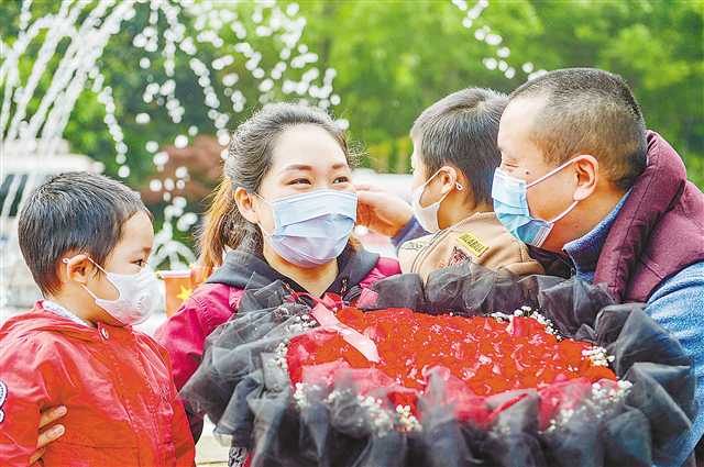 車停穩(wěn)后,圖圖抱著一大束花跑到車門前,看到爸爸張浩一下車就撲到他懷里。張浩是該院心內(nèi)科主治醫(yī)師,2月17日支援孝感后,圖圖就只能通過視頻看到爸爸。為表達(dá)自己對爸爸的思念,圖圖向媽媽提議“用自己的壓歲錢給爸爸買束花”。雖然嘴上沒說什么,張浩的眼眶卻紅了,緊緊地抱住妻子和兒子。