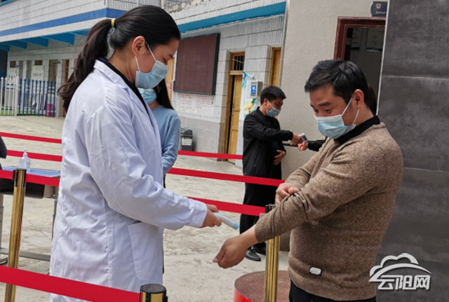 當日上午,由教職工扮演的學生在校門口指定位置,按要求分批次、分通道依次入校。校門是校園的第一道防線,必須嚴防死守。進校時,檢查人員首先檢查學生是否規范佩戴口罩、是否站在一米間距紅線上,然后測試體溫,檢查消毒洗手等情況。對于體溫≥37.3℃的學生,檢查人員將及時通知班主任聯系家長,同時走專用通道將其送至臨時隔離區。學校消毒人員對校園校門、測溫通道和隔離觀察室等場所及時消毒處理。