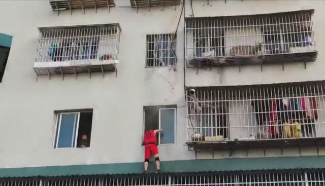 3.【云陽這個派出所長,你徒手爬窗救人的樣子好帥!】4月26日,寶坪鎮派出所附近一住宅樓里起火,一位91歲老人被困家中。緊急時刻,該派出所所長楊峰徒手攀爬上三樓,救下老人。