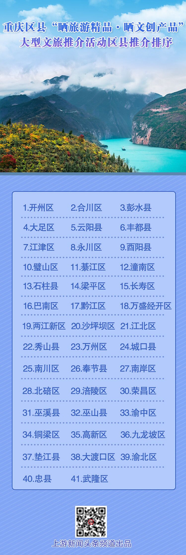 按照“推動高質量發展,創造高品質生活”的要求,深度挖掘重慶38個區縣(自治縣)和兩江新區、重慶高新區、萬盛經開區文化旅游資源產品,充分展示區縣積極應對疫情、促進文化旅游消費的措施、效果,重慶區縣“曬旅游精品·曬文創產品”大型文旅推介活動(以下簡稱“雙曬”第二季)將于6月正式拉開序幕,活動將持續到11月結束。