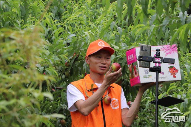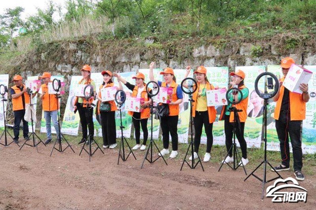 云陽網訊(記者 付驁 實習生 洪琳)5月27日,在渠馬鎮促進村桃園基地,滿園的桃樹枝繁葉茂、鮮果垂枝,讓人垂涎欲滴。一群身穿橙色背心的本土主播走進果園,現場品嘗油桃,為全國各地的網民朋友介紹油桃的生長情況、管護流程、成品果子的采摘細節等。