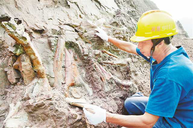 該化石群橫跨中侏羅世早中晚期,種類多、分布廣,橫跨四個(gè)鄉(xiāng)鎮(zhèn)。在同一地層走向上,連續(xù)15公里的化石集中埋藏,堪稱“恐龍化石長城”,埋藏形式世所罕見。已發(fā)掘形成的長150米、高8米、化石4000多處的侏羅紀(jì)恐龍化石墻,單體規(guī)模上迄今居世界第一。而整個(gè)化石群目前發(fā)掘暴露出來的化石已接近1萬塊,包括基干蜥腳型類、蜥腳類、獸腳類、鳥腳類、劍龍類,以及以蛇頸龍類、龜類等水生爬行類動(dòng)物化石和雙殼類為代表的無脊椎動(dòng)物化石。