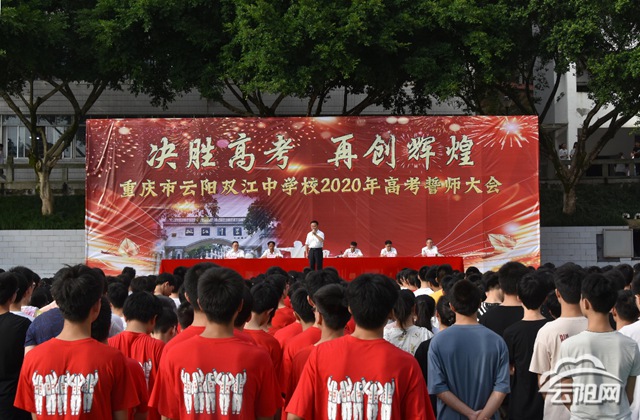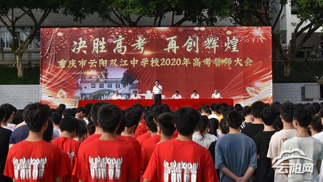 云陽網訊 (通訊員 陳垣廷) 7月3日一大早,云陽迎來了久違的太陽。在和煦的晨風中和溫暖的陽光下,雙江中學高2020級1464名考生,舉行了隆重熱烈的高考考前誓師大會。
