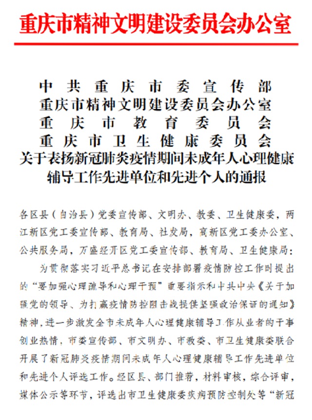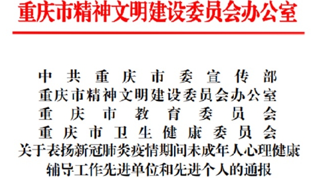 7月7日,市委宣傳部、市精神文明辦、市教委、市衛健委聯合發文,表彰新冠肺炎疫情期間未成年人心理健康輔導工作先進單位和先進個人。其中,來自云陽的重慶市中山外國語學校獲評先進單位,該校健康教師顏曉榮獲評先進個人。