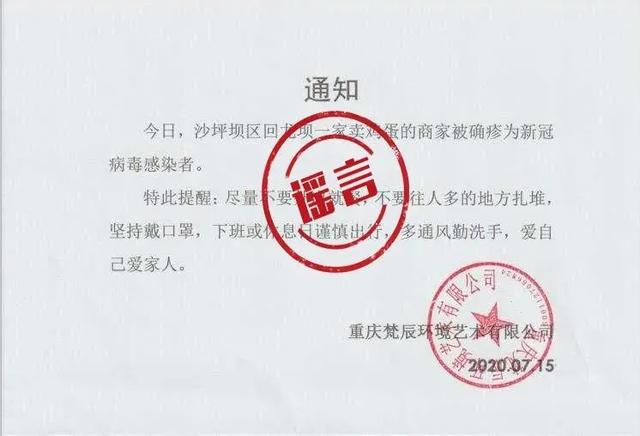 近日,在多個微信群內瘋傳一張關于沙坪壩區回龍壩一家賣雞蛋的商家被確疹(診)為新冠病毒感染者的圖片。