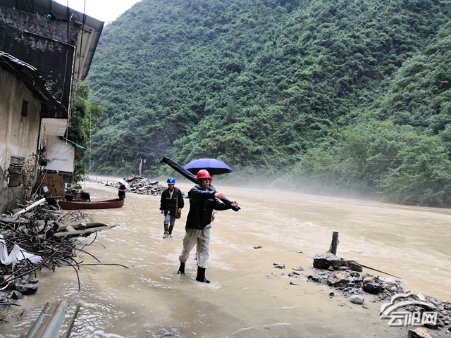 “由于基礎滑坡,該村10千伏倒桿就有5基,昨天由于大暴雨板板橋處溪水猛漲,多處出現道路塌方,無法達到現場。今天,我們淌水過河,帶著工具和材料徒步來到這里。”江口供電所片區負責人王敬一邊組織人員清障一邊講到線路受損情況。