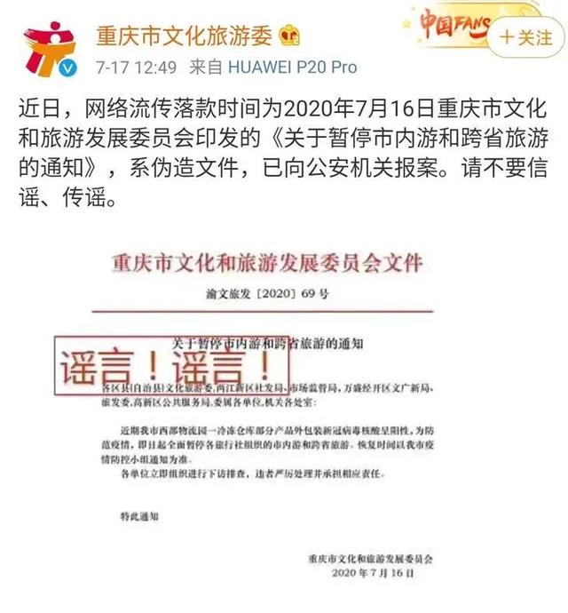 這個消息嚇到了很多有暑期出行計劃的重慶人。不過,請各位放心,這是假消息!@重慶市文化旅游委 17日發布消息,確認此文件系偽造文件,已向公安機關報案。請不要信謠、傳謠。