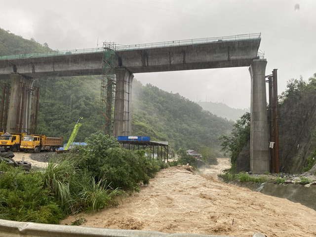 云陽網訊(通訊員 劉宇星)7月17日,中建隧道承建的“超級工程”鄭萬鐵路重慶段土建七標四工區所在地區云陽縣棲霞鎮,在經歷了兩天一夜的暴雨后,多處房屋被淹、山體滑坡、道路中斷。同時,四工區黃石隧道進口與拌和站出現洪澇。鄭萬鐵路重慶段土建七標四工區黨支部書記、工區經理、抗洪組長梁鵬與安全總監牛慶預判險情,提前發布洪澇預警,并迅速按安全演練方案展開緊急抗洪排險。截至7月18日中午,并未出現人員傷亡。