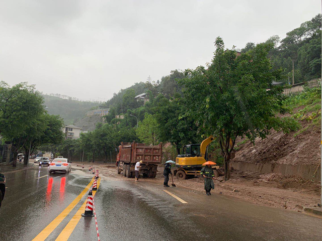 在稻香路,挖掘機和工人們正冒雨排危搶險。此處受災點是于18日凌晨2:00發生大面積邊坡垮塌,幾百方泥石將道路完全阻斷。記者在現場看到,經過連夜搶險作業,現場道路已恢復單邊通行。“我們連夜組織人員調集一臺挖掘機、四臺車輛連夜進行搶險,下一步我們要繼續清理,再用環衛車進行清洗。”縣市政設施管理所副所長曾勇介紹現場情況。