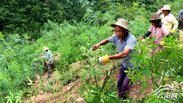 七月,花椒采摘進入尾聲,平安村村民李孟蘭正和大伙兒一起采摘最后一批花椒,并給花椒樹修枝。