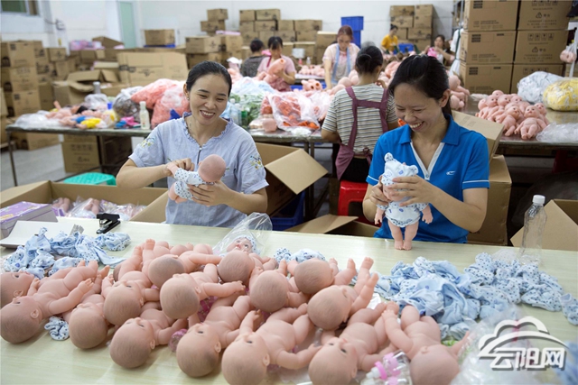7月31日,工人在高陽鎮返鄉創業園優多科技有限公司給玩具娃娃完成穿衣服、包裝等工序。
