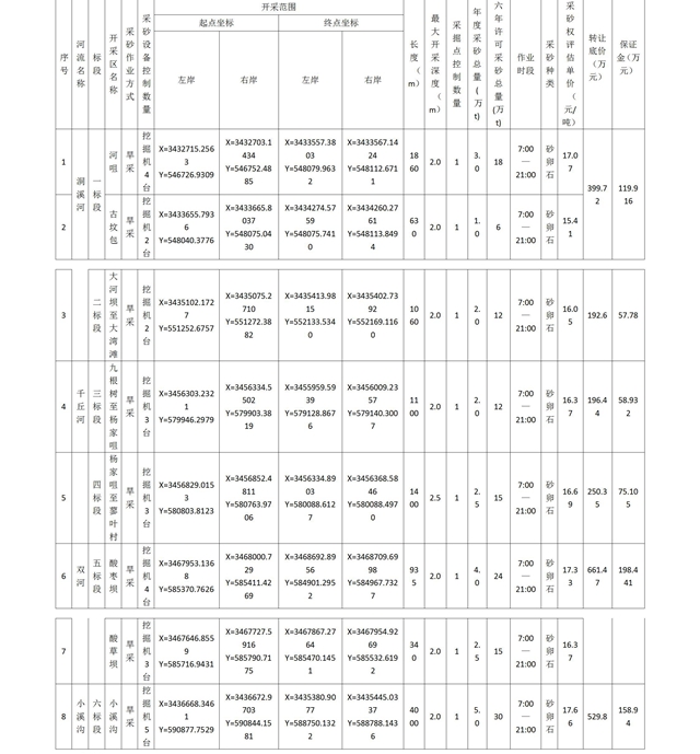 標的系云陽縣洞溪河、千丘河、雙河、小溪溝4條河流6個標段8個開采區6年河道砂石資源開采權。出讓期限為2020年9月1日至2021年2月28日、2021年7月1日至2022年2月28日、2022年7月1日至2023年2月28日、2023年7月1日至2024年2月29日、2024年7月1日至2025年2月28日、2025年7月1日至2025年12月31日,每年3月1日至6月30日為禁采期。擬按標段現狀以不低于轉讓底價協議或競價方式分零出讓,詳情如下: