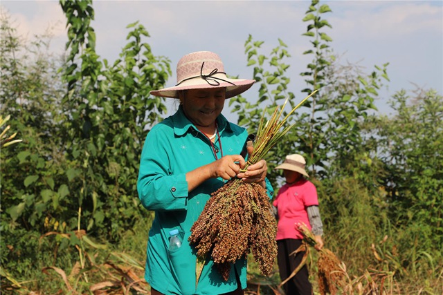“我家今年預計能收2000余公斤高粱,能收入1萬多元?!兵P凰村高粱種植戶魯右杰手持鐮刀利索地割下高粱稈,將收割了的高粱穗疊放在背簍里。