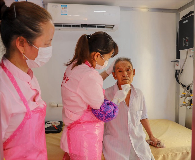 一大早,泥溪鎮敬老院9位高齡“五保”老人在院長黃仁清的陪伴下來到敬老院樓下。這些老人中,有的身有殘疾,有的因病腿腳不便,有5位都屬于半失能老人。工作人員了解情況后,先為老人開展量血壓、測體溫等常規檢查。隨后,工作人員對助浴室里的浴缸進行消毒殺菌并放上水,水溫根據需求保持在38~42攝氏度。在工作人員的攙扶下,老人小心翼翼地上了助浴車。在車上,老人們不僅舒舒服服地洗了個澡,還享受了剪指甲、刮胡子等服務。半天下來,洗完澡的老人個個兒容光煥發。“這么熱的天洗個澡,整個人清涼又舒服!”一位老人們笑呵呵地說道。