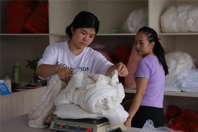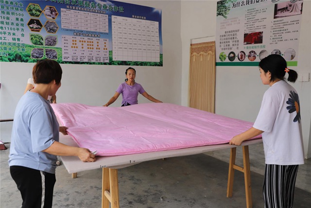 “一床特級蠶絲被大約1至3公斤,售價為880元至2080元不等。”雙壩村蠶桑專業(yè)合作社負責(zé)人張紅斌說,桑蠶絲被譽為“纖維皇后”,隨著人們生活水平的不斷提高,蓬松輕柔的手工蠶絲被也走入尋常百姓家。