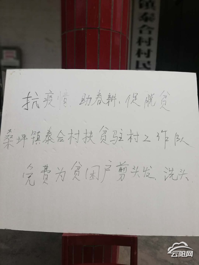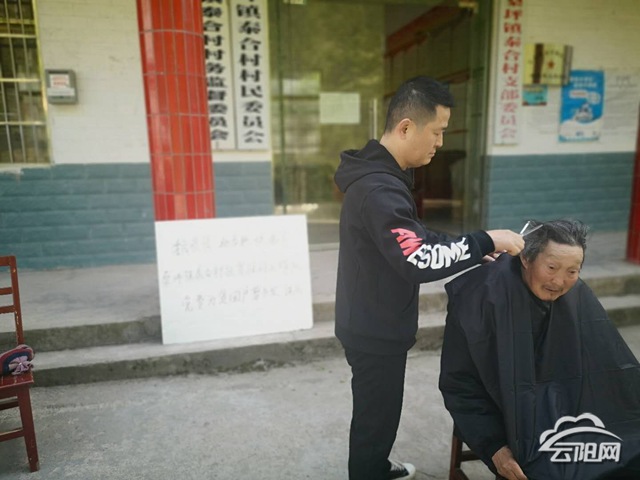 在泰合村辦公室外,掛起了免費(fèi)剪頭發(fā)、洗頭的牌子,原來是劉赤軍為貧困戶、五保戶和老人義務(wù)理發(fā)。