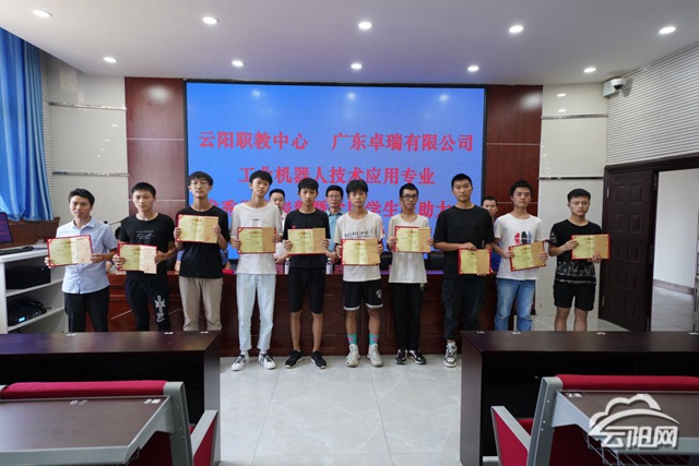 據了解,云陽職教中心與企業聯合開辦了工業機器人專業,此次評選根據該專業110名學生的德、智、體、美、勞、技等方面綜合進行,共評選了12名成績優秀、表現突出的學生,其中一等獎學金3名、二等4名、三等5名。