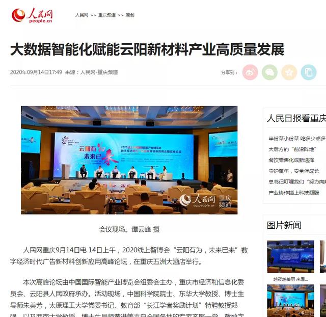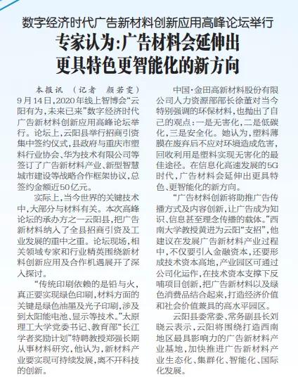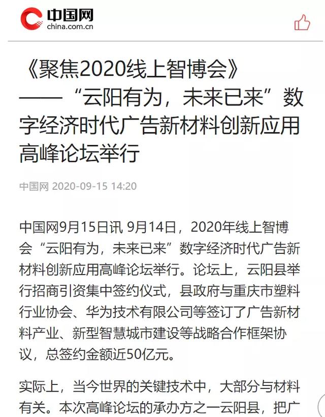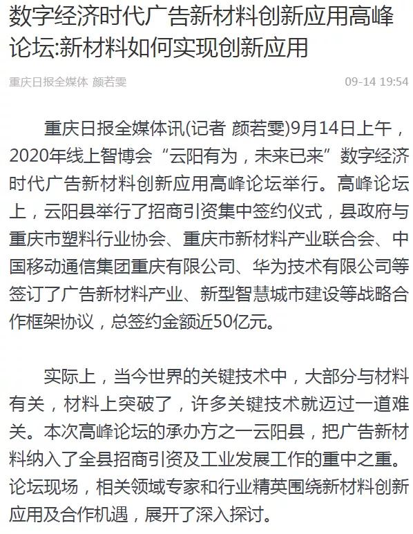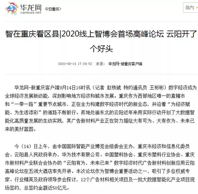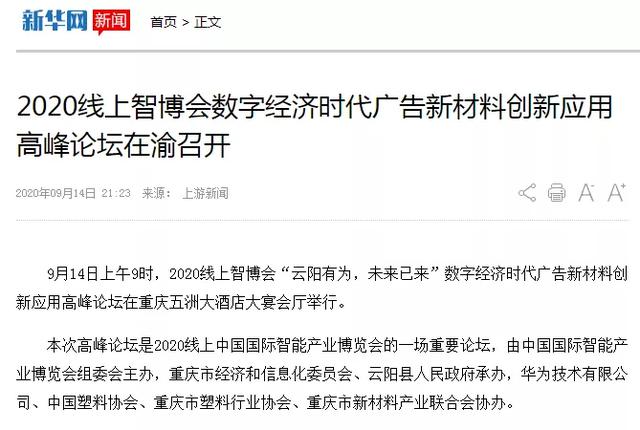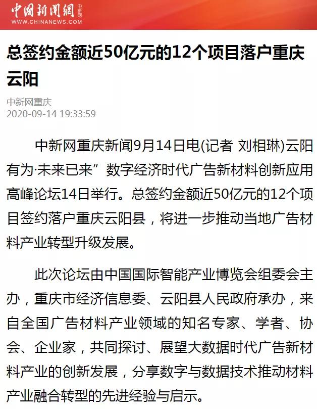9月14日,2020線上中國國際智能產(chǎn)業(yè)博覽會——“云陽有為,未來已來”數(shù)字經(jīng)濟(jì)時(shí)代廣告新材料創(chuàng)新應(yīng)用云陽高峰論壇在重慶舉行。