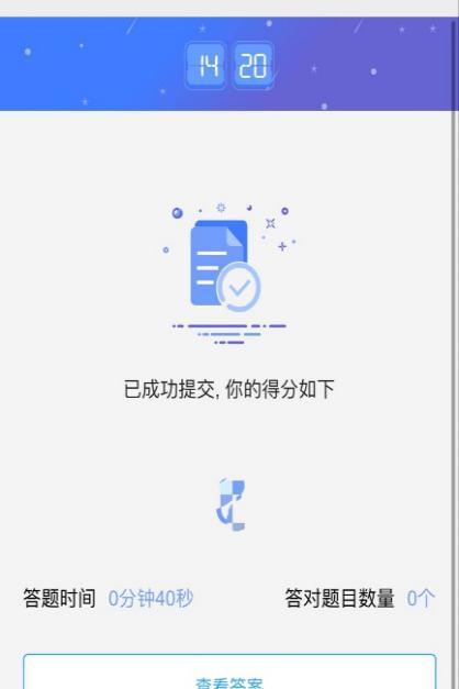 答題完成后,點擊提交答案,系統自動顯示答題分數、答題時間、答對題目數量、查看答案、查看排行等。