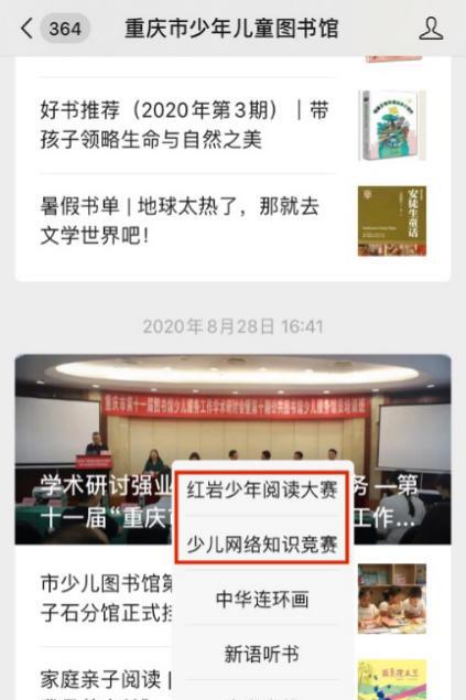 關注“重慶市少年兒童圖書館”微信公眾號,點擊“活動”——“紅巖少年閱讀大賽”