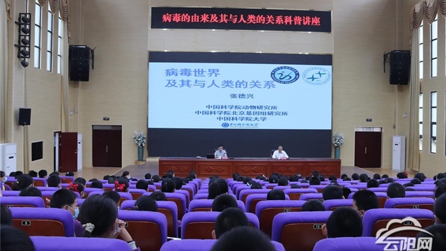 全國政協委員、中國科學院北京基因組研究所副所長張德興教授以“病毒的由來及其與人類的關系”為主題,從“病毒是什么?奇特的病毒世界、病毒的由來、病毒與人類的關系”四個方面,將與會師生帶入了一個神秘、有趣的“病毒世界”,張教授風趣的語言、豐富的學識,不時引得師生的陣陣掌聲。