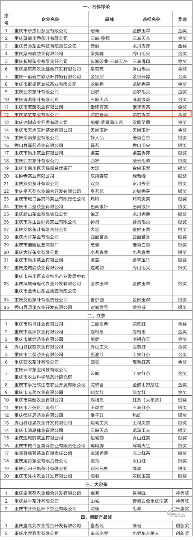經過審評,最終評選出重慶市第十三屆“三峽杯”名優茶金獎23個,其中綠茶金獎14個、銀獎21個,紅茶金獎9個、銀獎11個,大宗茶特等獎2個,一等獎1個,創新產品獎2個,“十大名茶”產品10個,“十大名茶”提名產品5個。