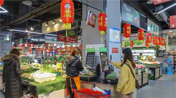 與傳統超市相比,這家智慧生鮮超市不僅將自主體驗區、糧油干貨區、蔬菜水果區、扶貧專柜區等功能區域劃分細致,且每個攤位前都懸掛著一塊智能顯示屏,循環播放商戶的營業執照等經營信息。此外,萬家驛智慧生鮮超市還在賣場的核心區域規劃了扶貧專區,銷售云陽本地的特色農產品,為市民選購正宗的農特產品提供了新選擇。