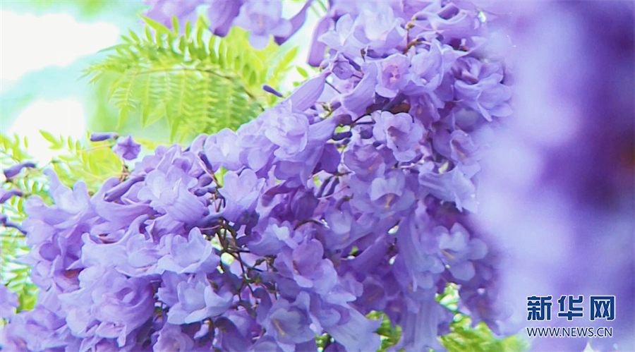 樹樹繁花從一大片綠色中透出來,綿延成一條條藍紫色的飄帶,如云似霞,如詩如畫,妝點了都市,也妝點了都市人的生活。新華網發(吳大維 攝)