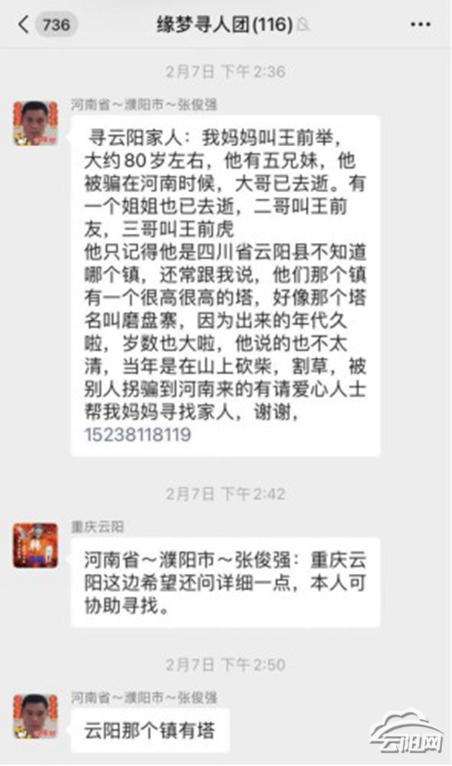 “年過80歲的王祥菊老人,1975 年被人從云陽拐到河南南陽至今,離開故鄉重慶云陽47年了,尋找云陽的哥哥王前虎、王前友,記得家鄉有個很高的塔叫磨盤寨。其女希望幫助媽媽在有生之年找到家鄉的親人。”