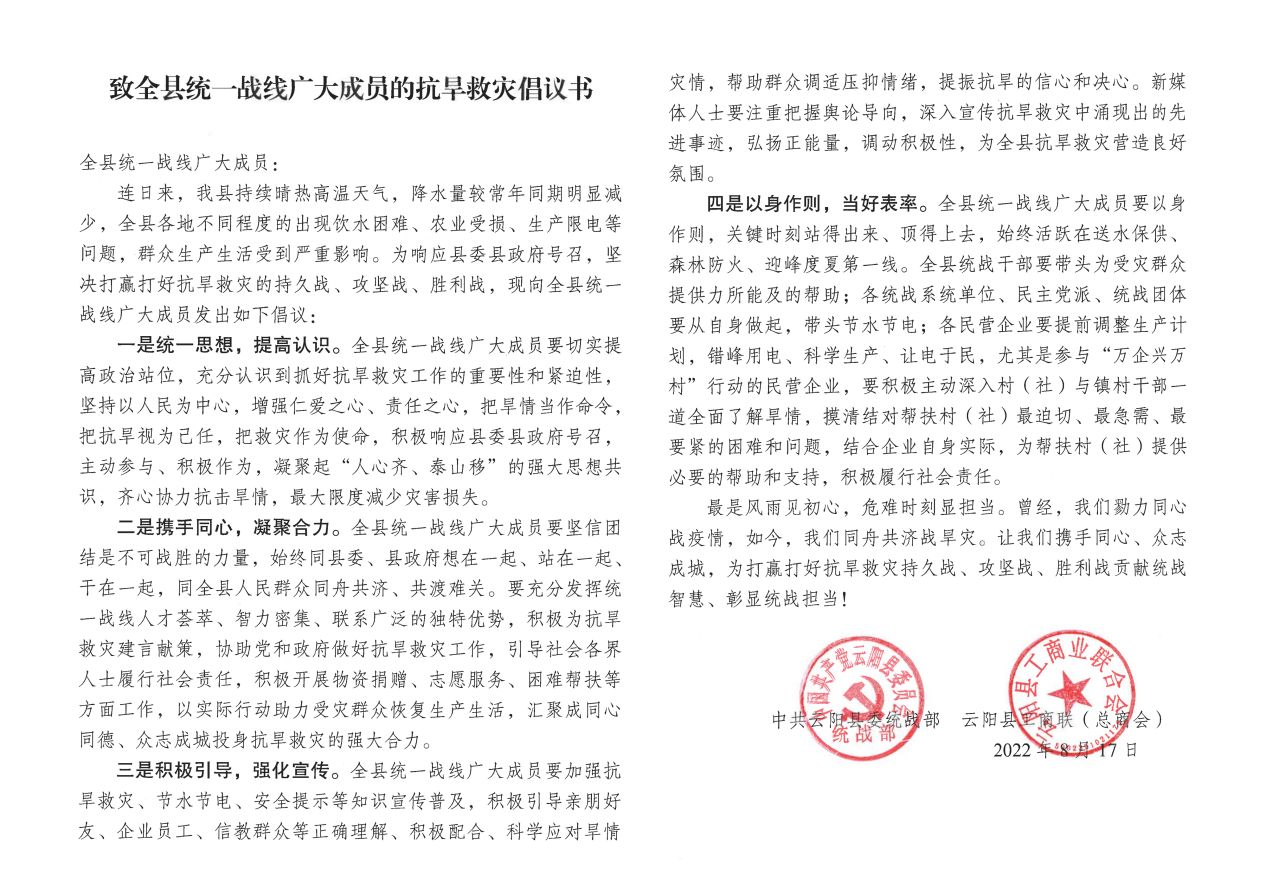 云陽(yáng)網(wǎng)訊(通訊員 扶曉)近日,為有效應(yīng)對(duì)今年極端天氣造成的農(nóng)村部分地區(qū)生產(chǎn)生活用水困難、農(nóng)業(yè)受損、生產(chǎn)限電等問(wèn)題,按照全市統(tǒng)戰(zhàn)部長(zhǎng)會(huì)議暨全市統(tǒng)一戰(zhàn)線“大走訪大談心活動(dòng)”總結(jié)部署會(huì)“要服從服務(wù)全市中心大局”要求,以及縣委縣政府抗旱救災(zāi)工作調(diào)度會(huì)議精神,云陽(yáng)縣委統(tǒng)戰(zhàn)部、縣工商(總商會(huì))向全縣統(tǒng)一戰(zhàn)線廣大成員發(fā)出了《致全縣統(tǒng)一戰(zhàn)線廣大成員的抗旱救災(zāi)倡議書》,倡議廣大統(tǒng)戰(zhàn)成員,切實(shí)提高思想認(rèn)識(shí),圍繞當(dāng)前旱情,主動(dòng)作為,積極參與到全縣抗旱救災(zāi)工作中來(lái),積極為抗旱救災(zāi)建言獻(xiàn)策,協(xié)助黨和政府做好抗旱救災(zāi)工作,以實(shí)際行動(dòng)助力受災(zāi)群眾恢復(fù)生產(chǎn)生活,幫助解決受災(zāi)群眾最需要解決的困難和問(wèn)題,共同打贏打好抗旱救災(zāi)持久戰(zhàn)、攻堅(jiān)戰(zhàn)、勝利戰(zhàn)。倡議發(fā)出后,云陽(yáng)縣廣大統(tǒng)戰(zhàn)成員積極響應(yīng),勇?lián)鐣?huì)責(zé)任,齊心協(xié)力抗擊旱情災(zāi)情,竭盡全力減少災(zāi)害損失。